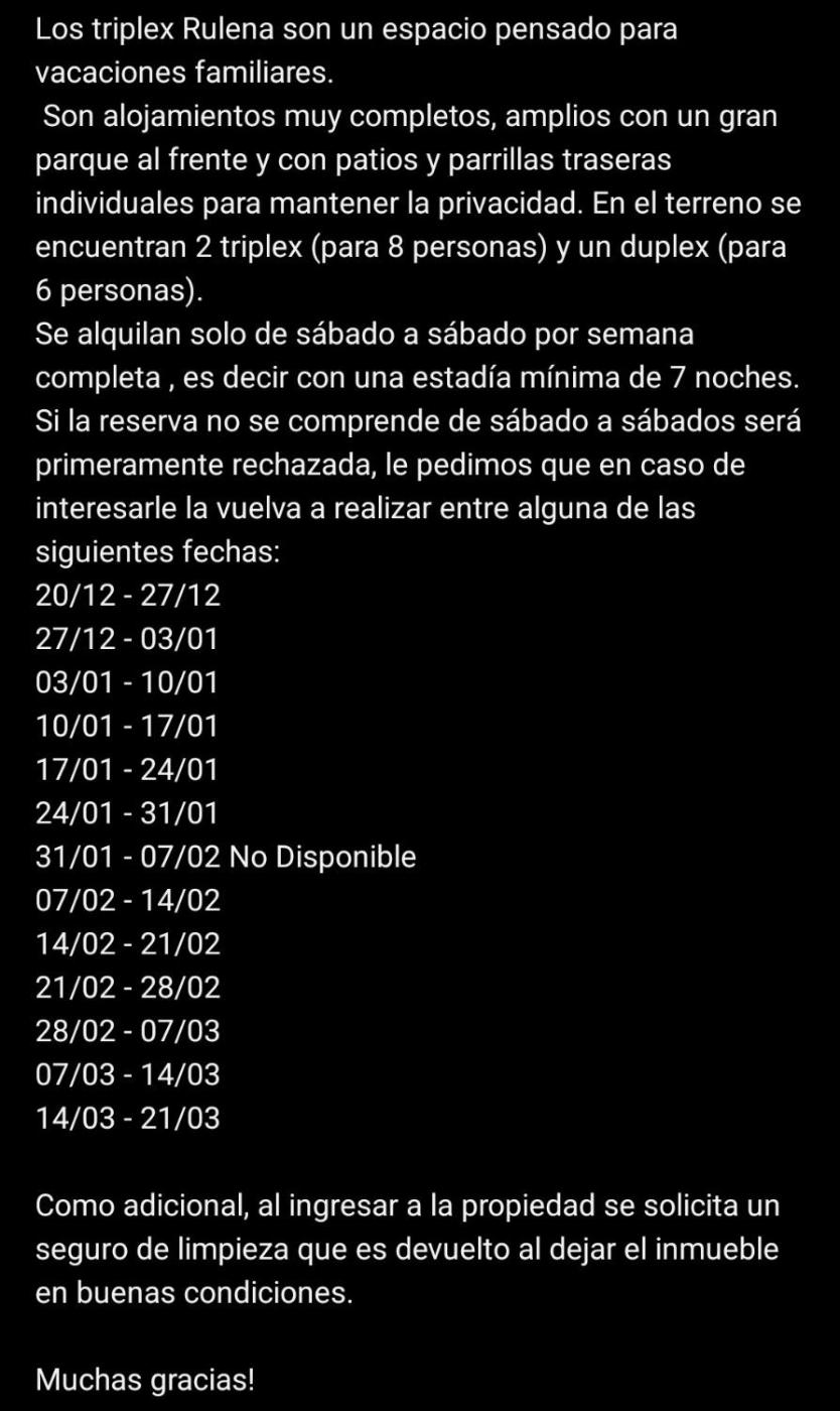 Triplex Rulena Costa se encuentra en Costa Azul, a solo 46 km de Termas Marinas, y ofrece alojamiento con terraza y wifi gratis. El alojamiento, que está a 4 min a pie de Playa San Bernardo, dispone de jardín y parking privado gratis.